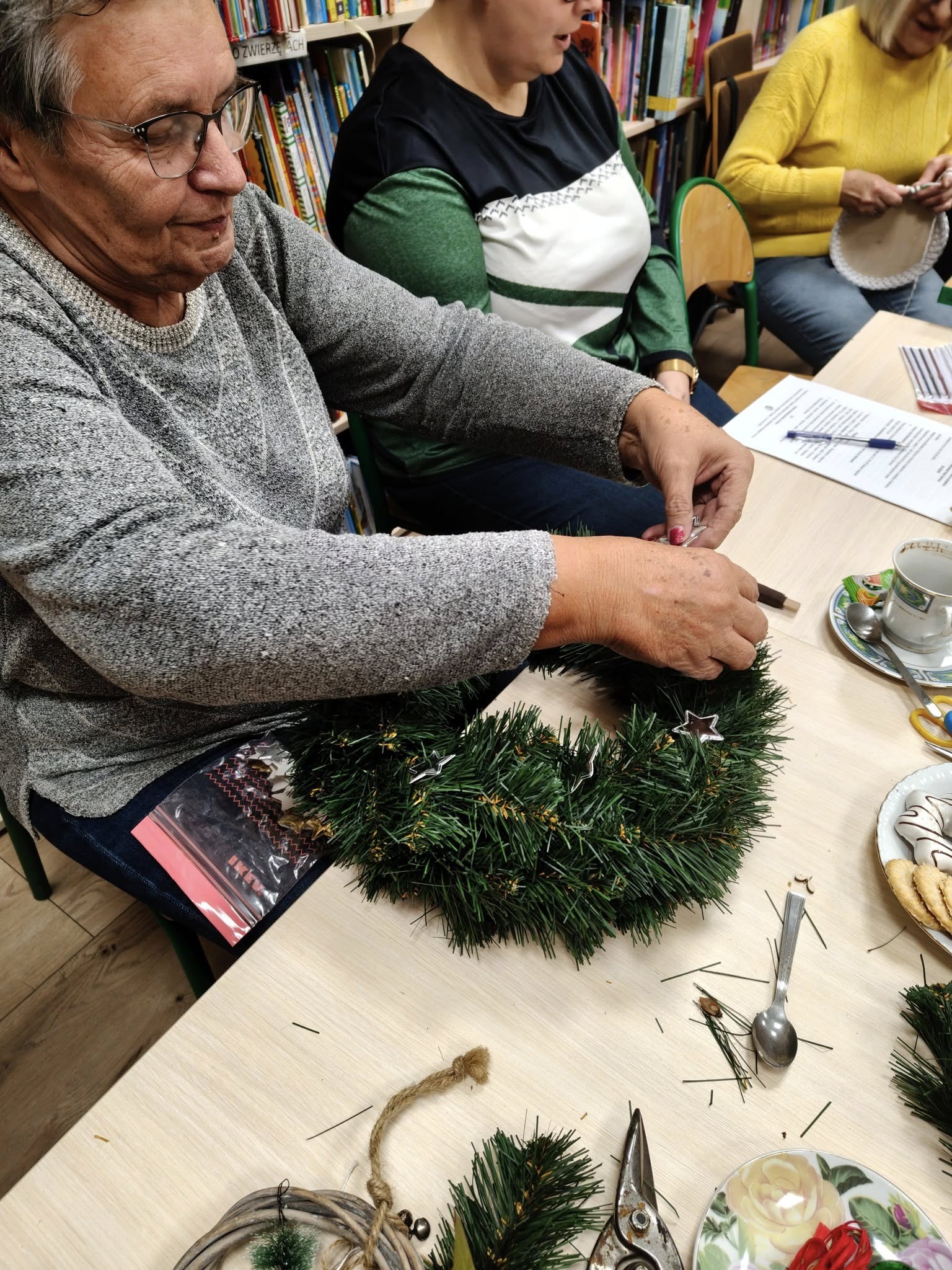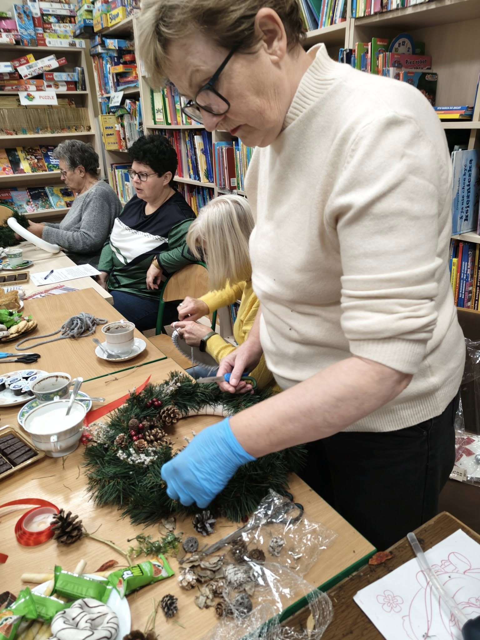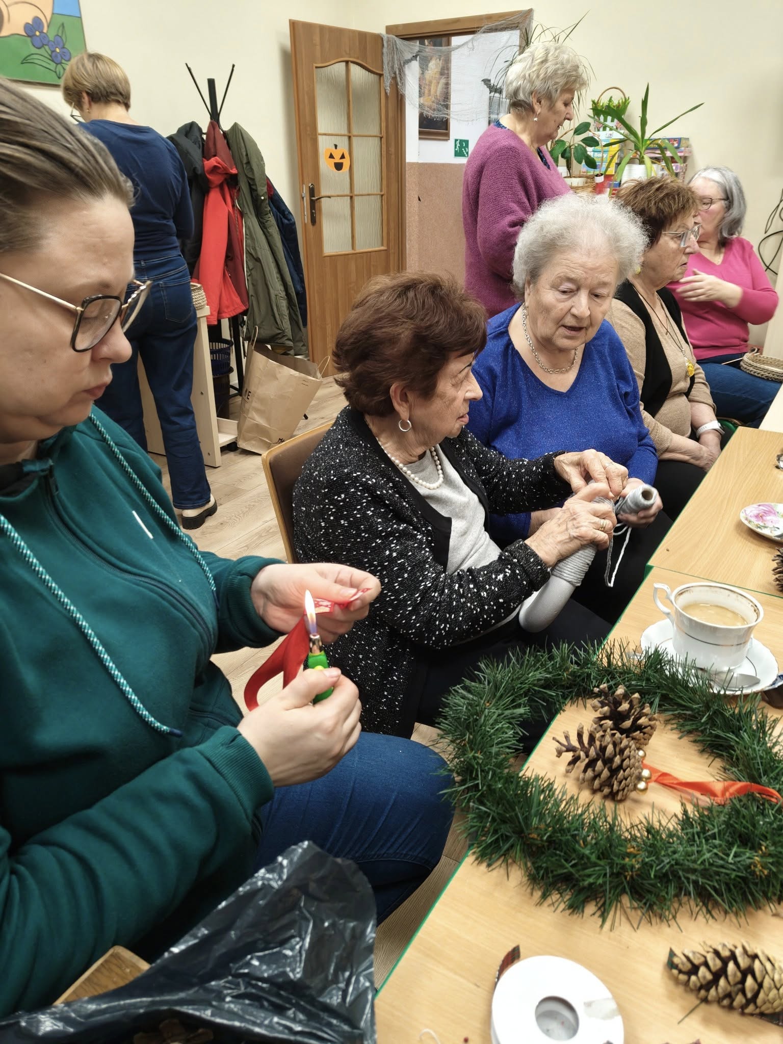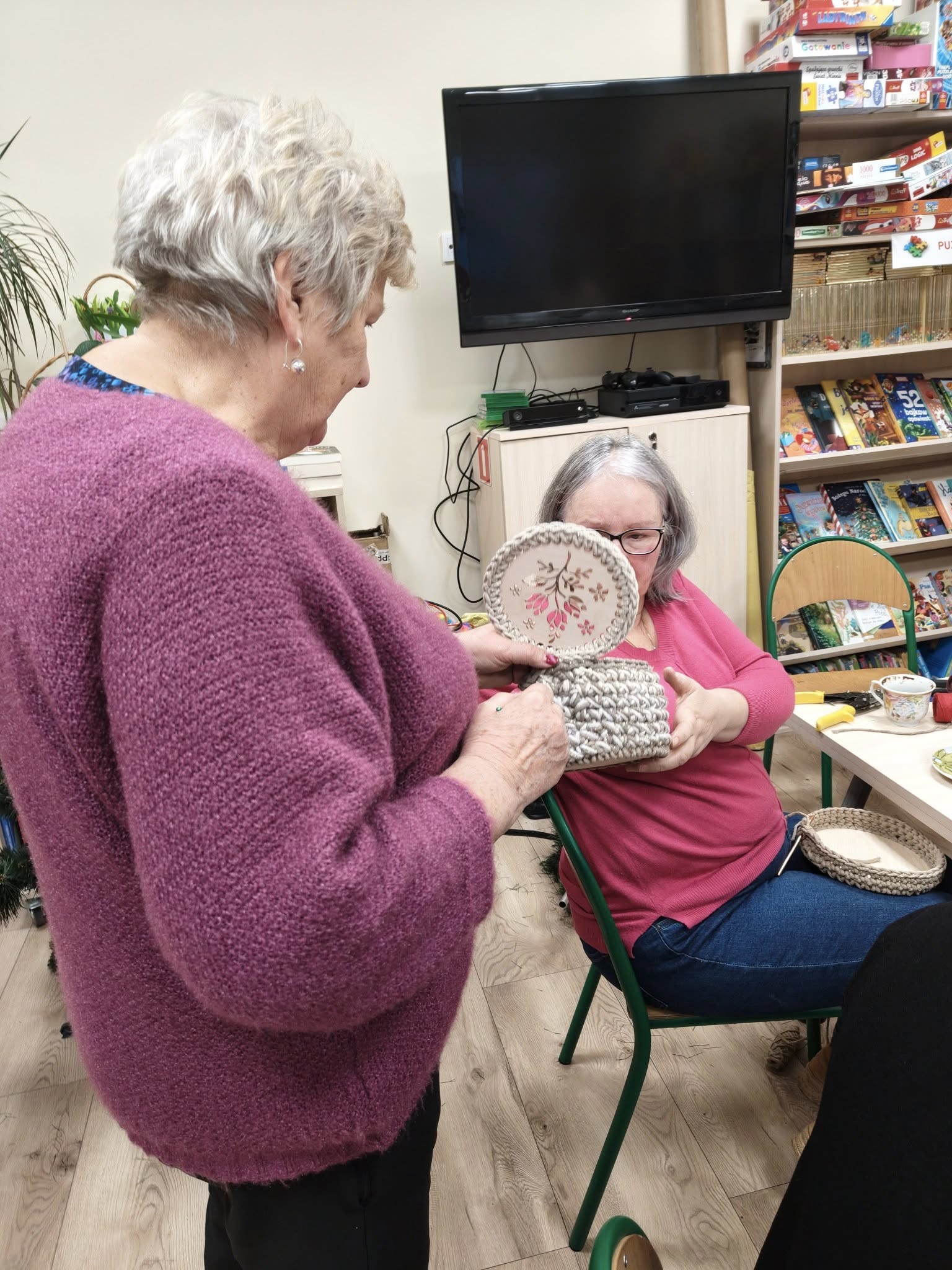 W dniu dzisiejszym nasze utalentowane panie na Kółku Robótek Ręcznych wykonywały już ozdoby świąteczne. Panie łączyły klasyczne techniki z nowoczesnymi pomysłami - szydełkowe koszyki, stroiki czy też wianki. Jak zwykle na naszych spotkaniach atmosfera robi największe wrażenie. Panie czują się jak u siebie, słychać gwar rozmów, śmiech, czuć aromat kawy,a i coś słodkiego również zawsze się znajdzie. Widać, że dla naszych pań rękodzieło to nie tylko hobby, ale to sposób na dzielenie się radością i możliwością obdarowania nią innych. Wszystkie ozdoby, które zostały dziś wykonane będzie można zakupić na tegorocznej wystawie stołów bożonarodzeniowych.