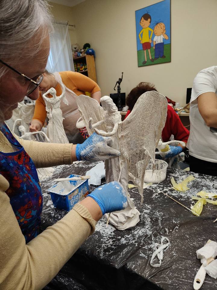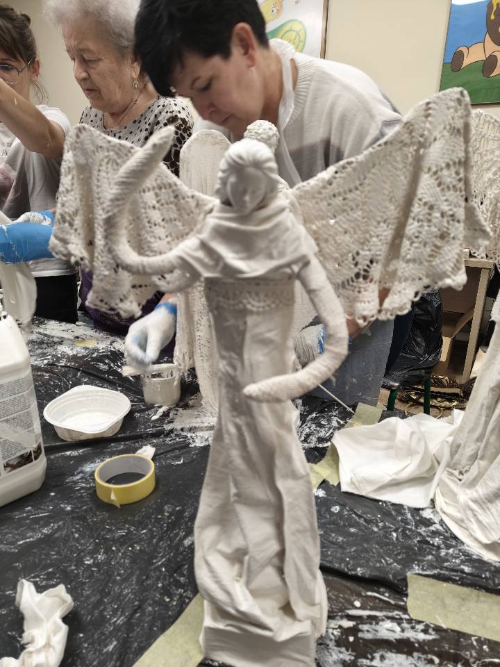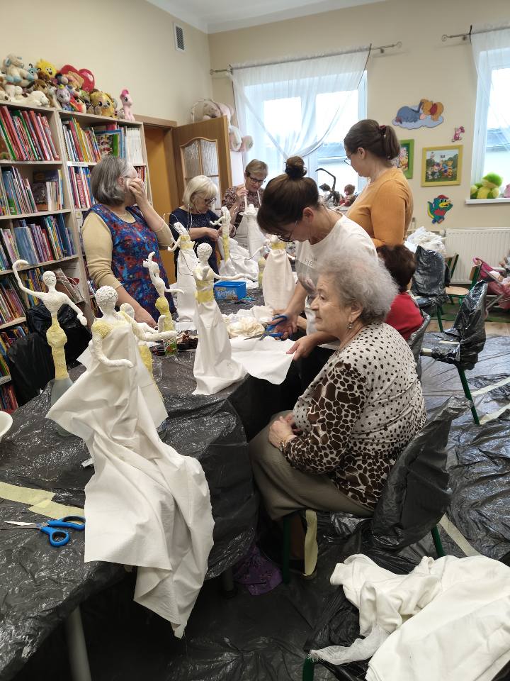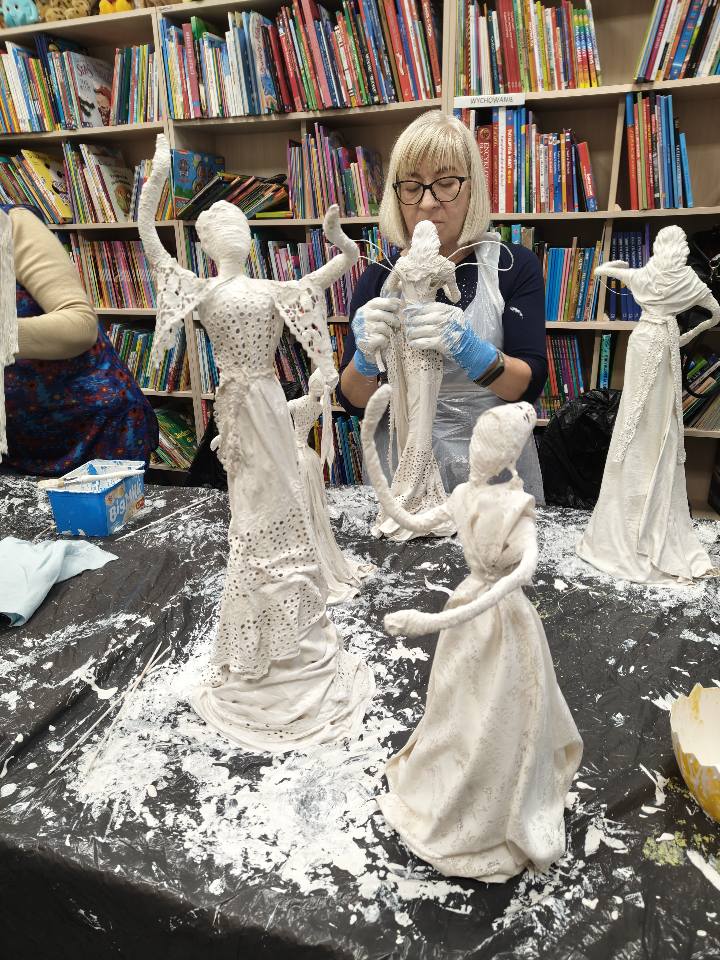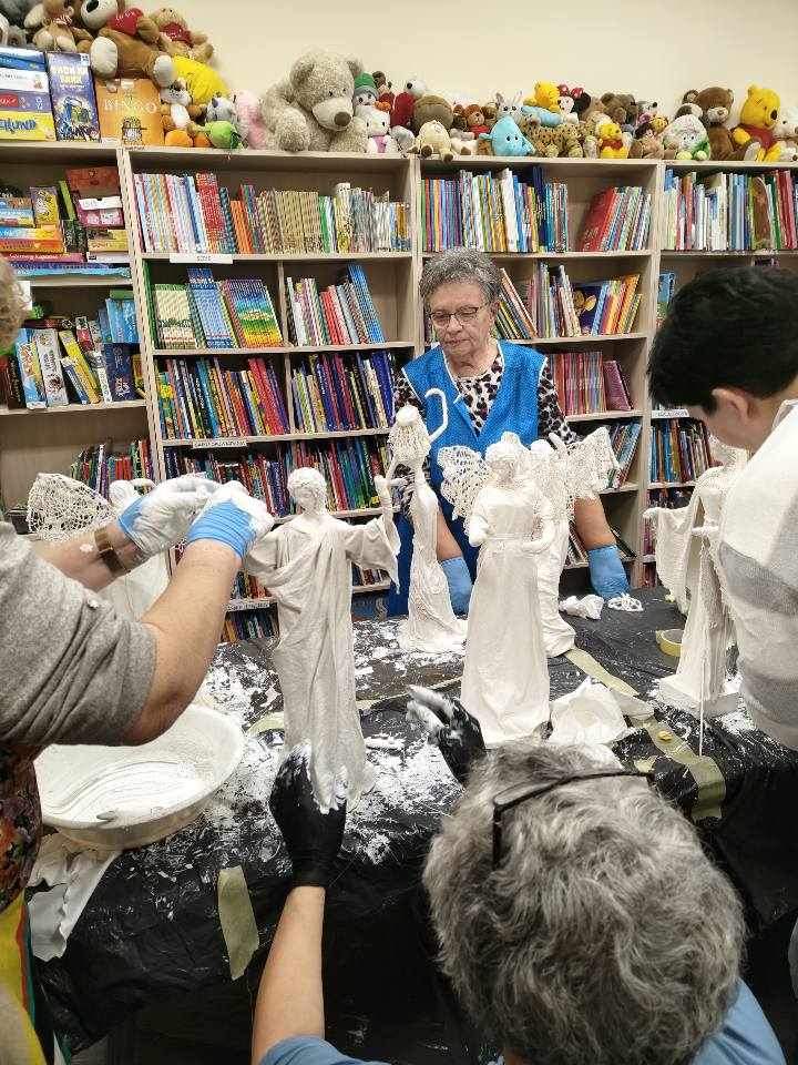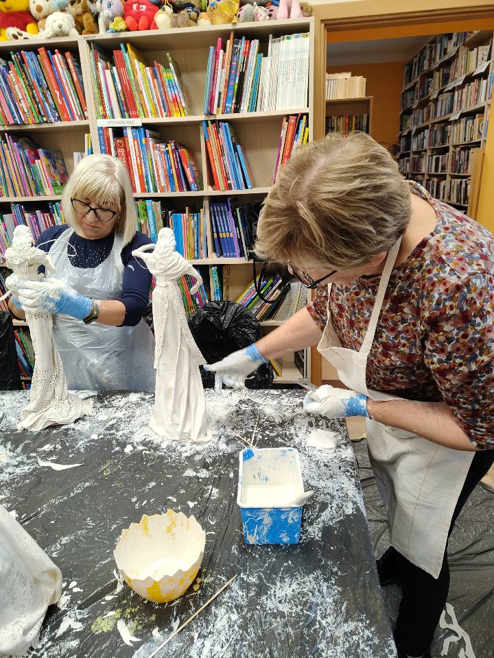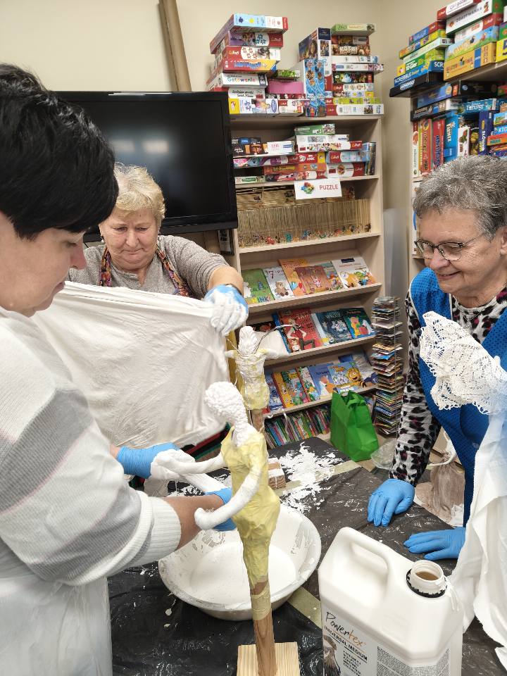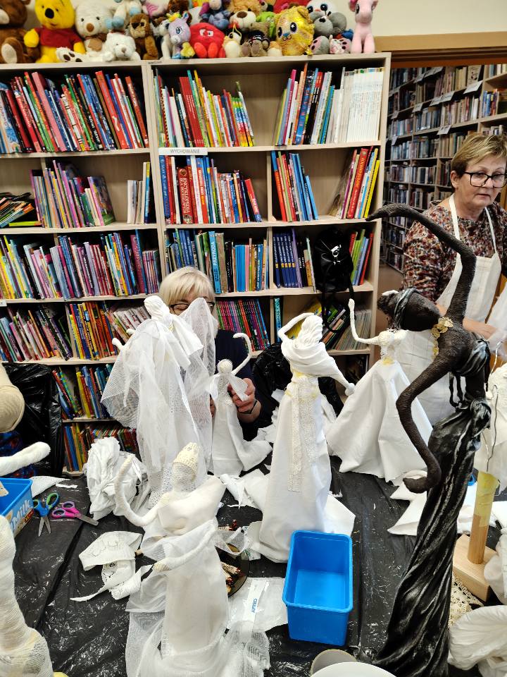 Ostatnie spotkanie z masy Powertex było dla naszych seniorek na prawdę wymagające- pełne skupienia, pomysłów i dokładności. Tworzyłyśmy stroje dla dam i aniołów, następnie przyszła kolej na "brudną robotę". Maczanie materiałów i nadawanie im charakteru było nie lada sztuką. Efekty tej pracy już wkrótce będzie można podziwiać w naszej Bibliotece! Zapewniamy - będzie na co popatrzeć
