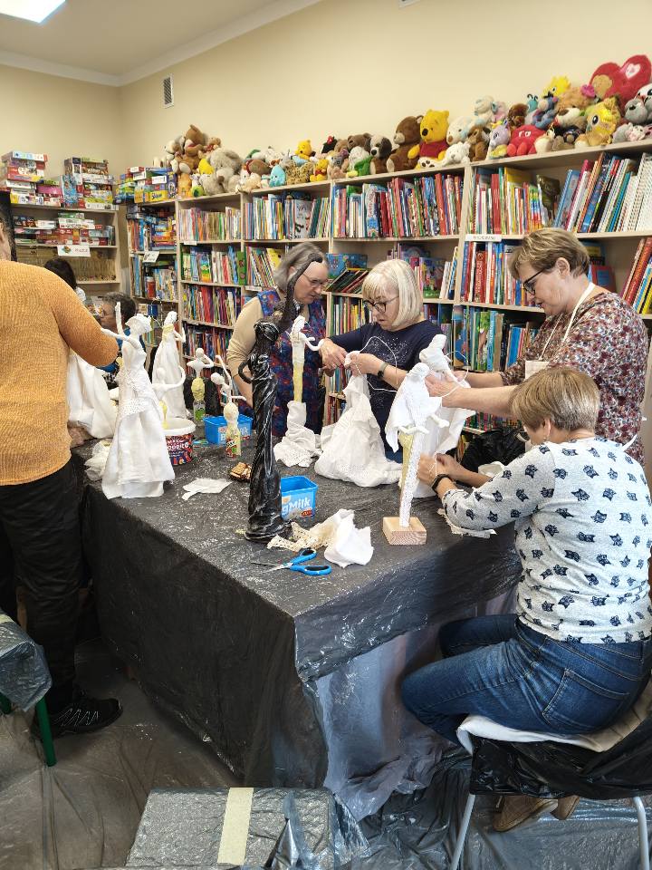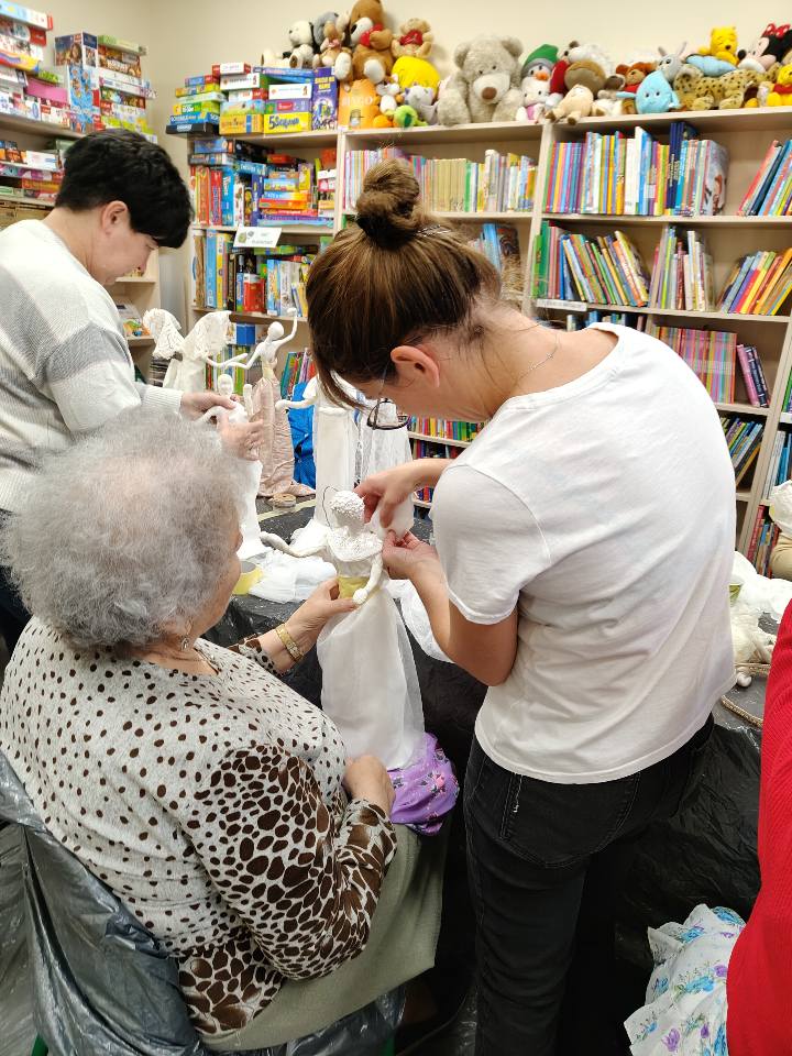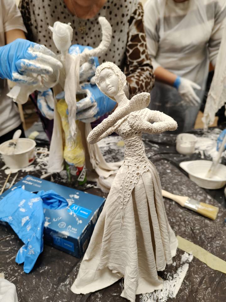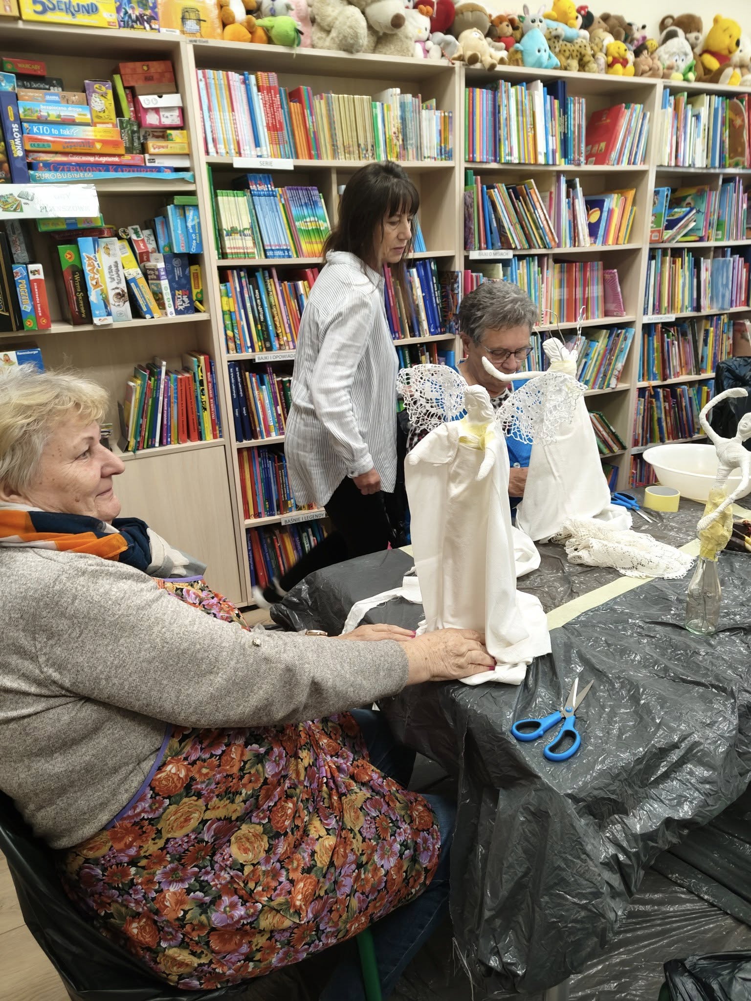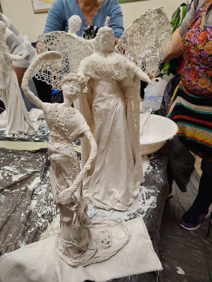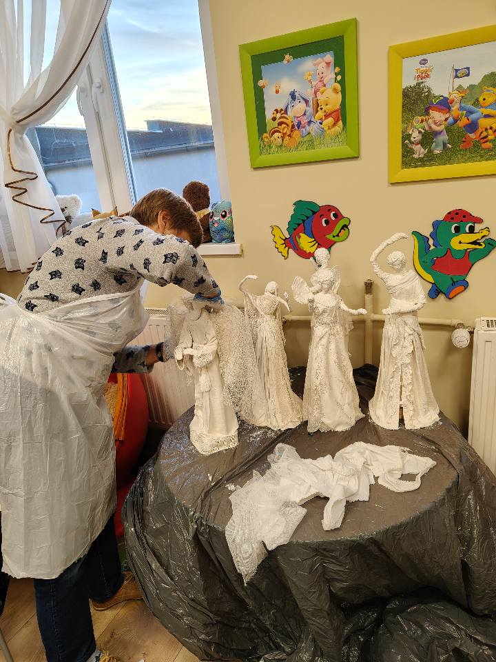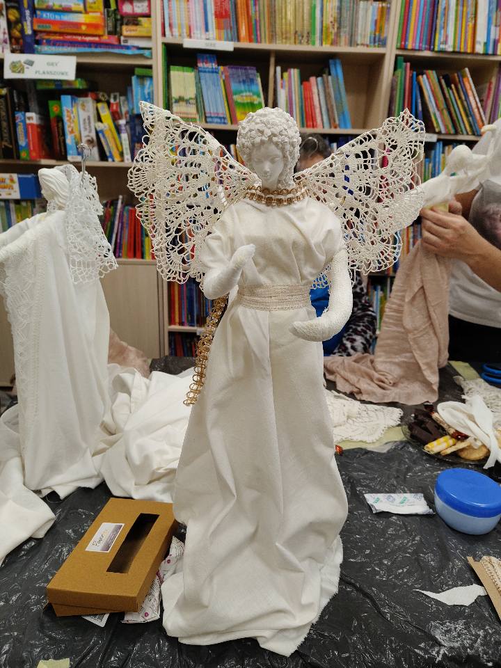 Ostatnie spotkanie z masy Powertex było dla naszych seniorek na prawdę wymagające- pełne skupienia, pomysłów i dokładności. Tworzyłyśmy stroje dla dam i aniołów, następnie przyszła kolej na "brudną robotę". Maczanie materiałów i nadawanie im charakteru było nie lada sztuką. Efekty tej pracy już wkrótce będzie można podziwiać w naszej Bibliotece! Zapewniamy - będzie na co popatrzeć