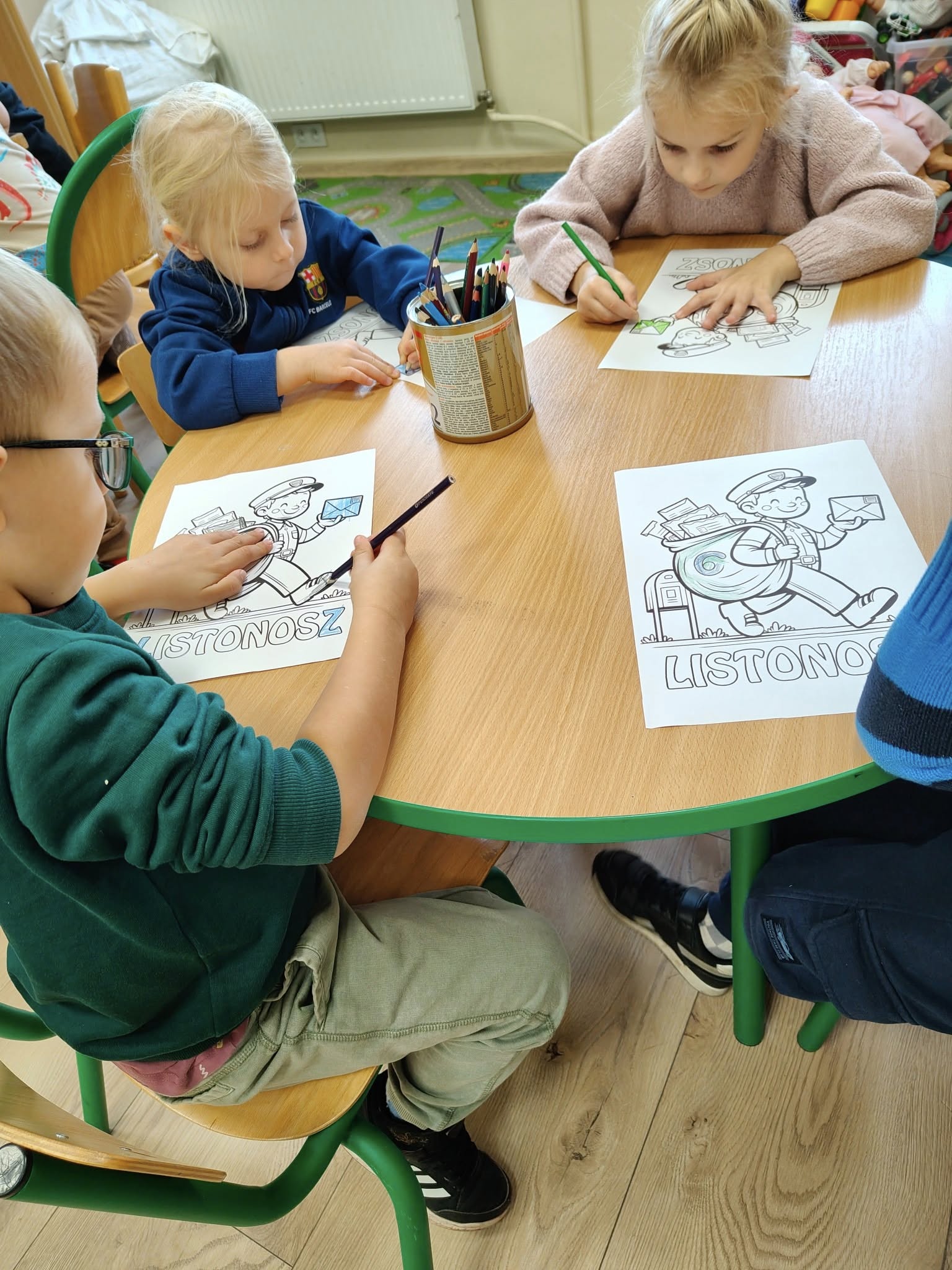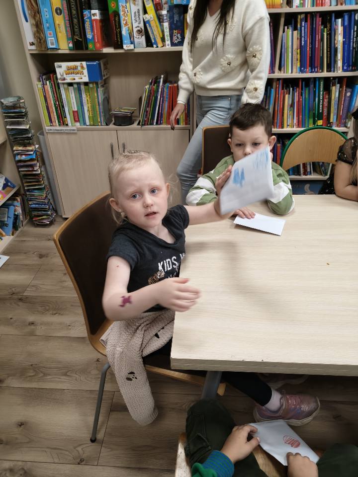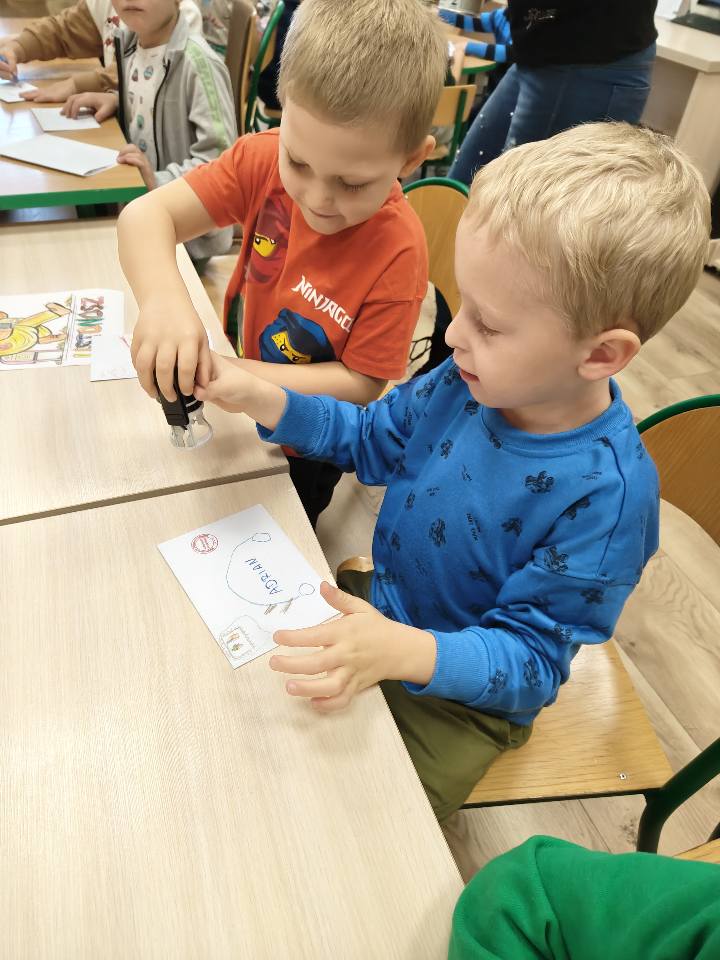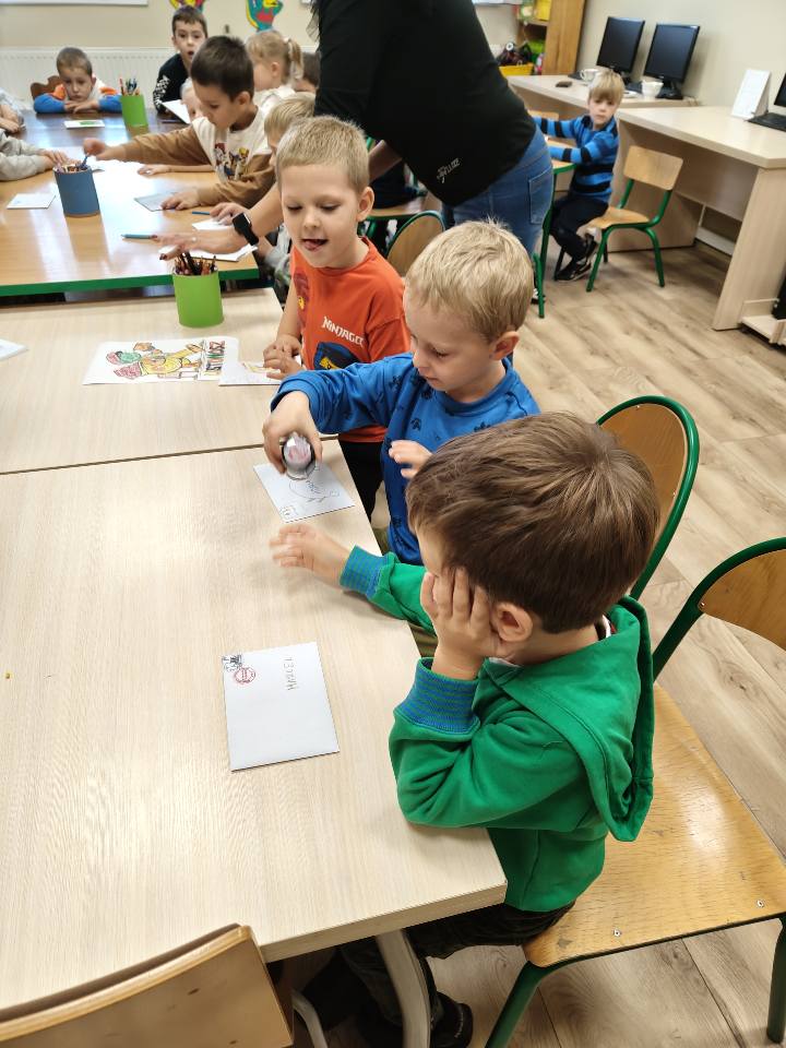 W środę, po przerwie wakacyjnej odwiedziła nas grupa przedszkolna "Smerfy" i wspólnie obchodziliśmy nadchodzący Dzień Poczty Polskiej. Dzieci z zaciekawieniem obejrzały bajkę o Listonoszu Pacie, poznały tajniki pracy na poczcie i dowiedziały się jak wygląda droga od nadawcy do adresata. Każdy z naszych uczestników miał za zadanie pokolorować obrazek, który następnie wysłał do swojego kolegi lub koleżanki. Największą frajdą było przybijanie pieczątek na kopertach oraz wrzucacie listów do skrzynki. Następnie przyszedł czas na zabawę.